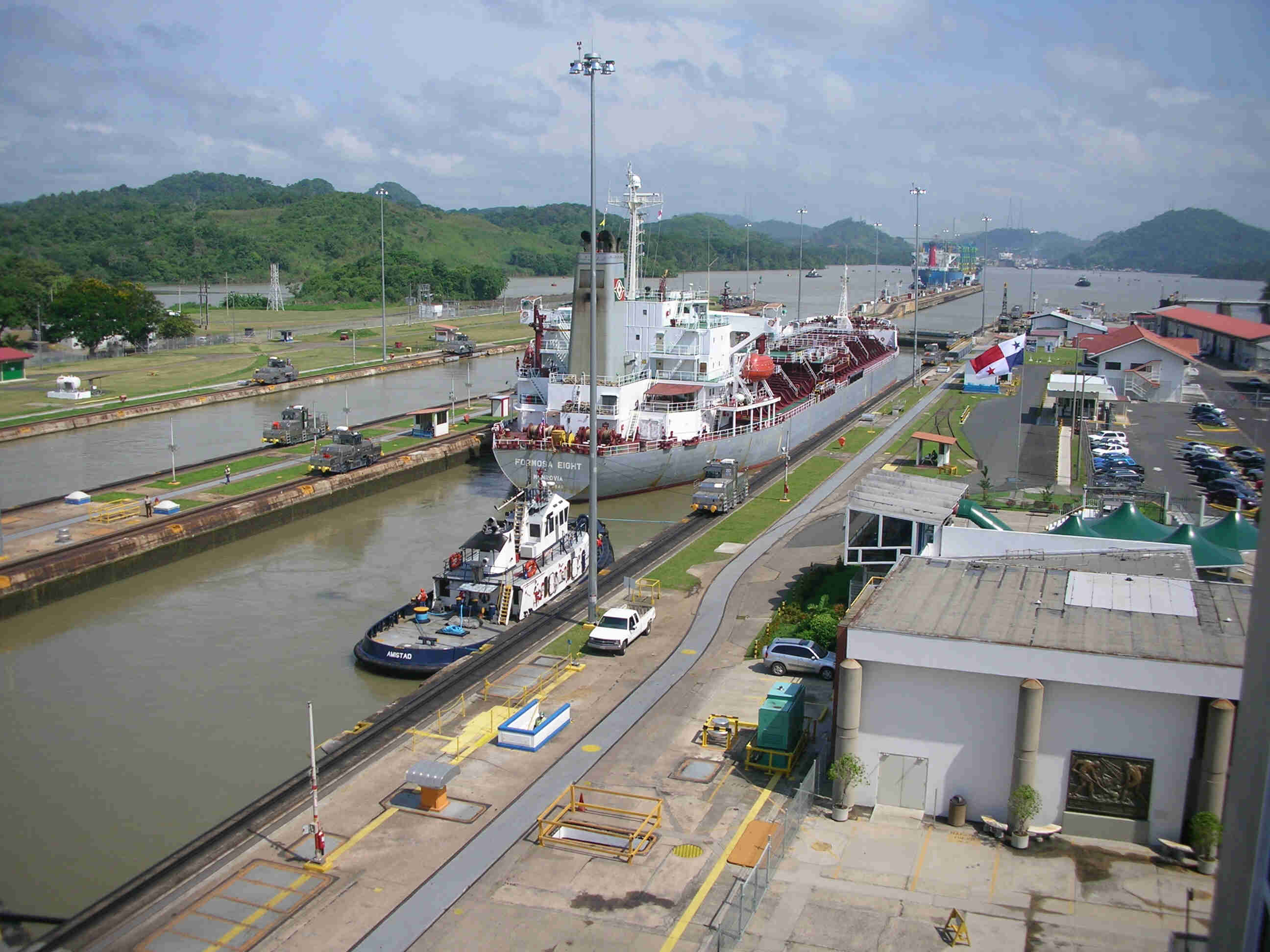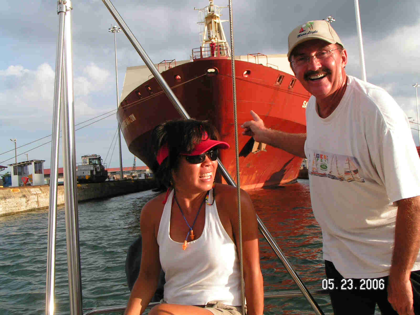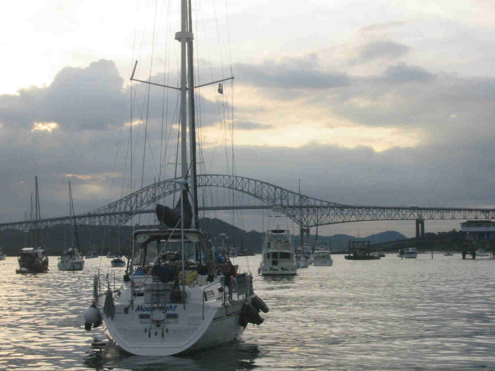 | THE INCREDIBLE PANAMA CANAL TRANSIT: To transit from the Pacific Ocean to the Caribbean a tidy sum of $600 is required. That is reasonable considering sailing 11,000 miles around South America and Cape Horn or the Straits of Magellan. We used a cab driver for the check-in procedure and arrange for the transit. His cost was $50 and worth it as he completed the paperwork cha-cha in 3 hours. We could have transited within a week but we wanted to explore Panama City in greater detail so we requested a three week wait. It was also worth it. We had crews (and dear friends) from two other cruising boats join us as line handlers. One was Hebe with Ariel and Tim on board and the other was Que Onda with Bill. After we had Moonlight tied to the dock in Shelter Bay Marina, we spent the night with the air conditioner on for the first time in months. The next day it was back to Balboa to be line handlers aboard Hebe as they transited the canal. We spent the night on Gatun Lake which was very cool with the howler monkeys in the jungle sounding their usual ominous roars. Also on our transit with Hebe, we side tied with Marina Tiare with John and Amanda Neal. They are a professional yacht and it definitely showed. Check out their website for far more details then we could provide. The morning of the transit MOONLIGHT is loaded with tires as fenders and ready for the Panama Canal. And we were on our way to the Caribbean up three locks, first the Miraflores locks and then Pedro Miguel Lock while passing large tankers. We developed a new appreciation for their size and power while joining them in the canal locks and across Gatun Lake and the Gaillard Cut.