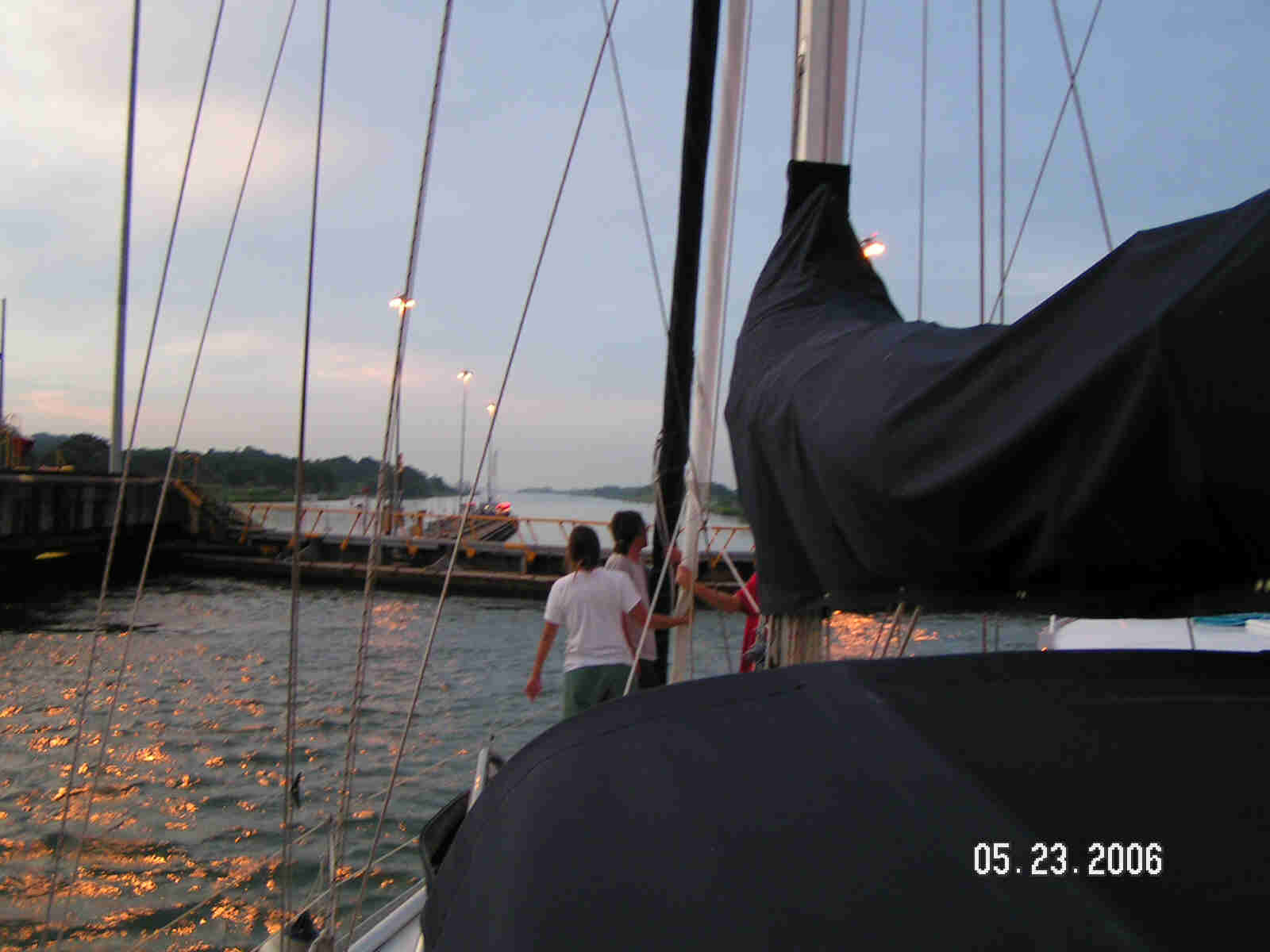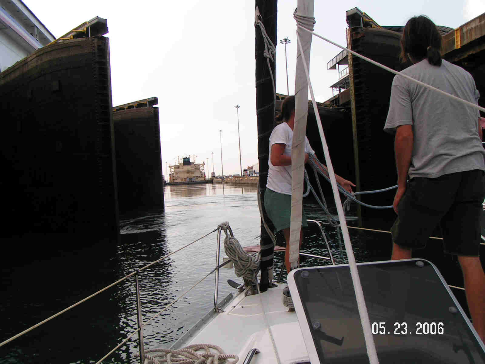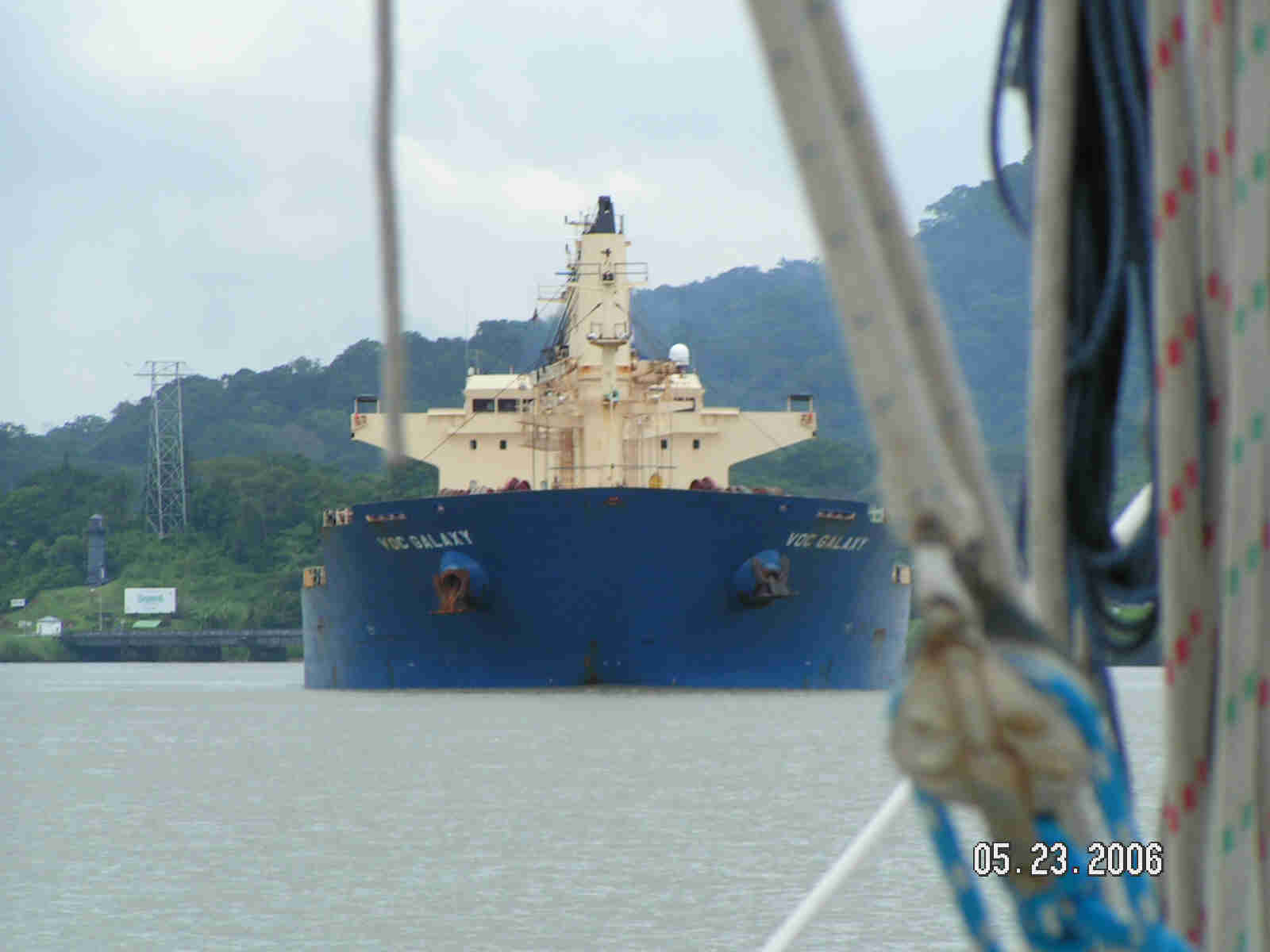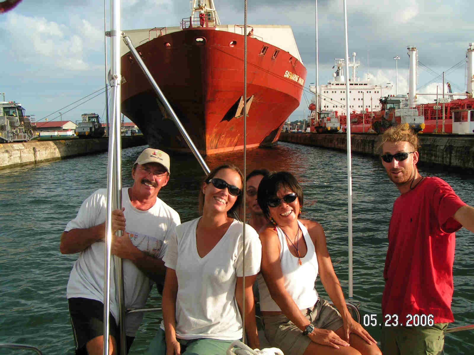 Locking down in the three Gatun Lake locks, we were followed by a big red freighter. Only time we ever want to be in this position. Transiting the canal was easy and truly an enjoyable experience especially when we arrived at the last lock. Our crew of Ron, Ariel, Bill, Yen and Tim made this a day long party even if Tim was busy kicking the skippers butt at chess. Then the beauty of the last set of locks into the Caribbean Ocean was grand indeed. |